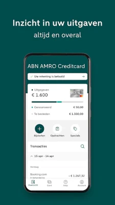 Keep track of your expenses wherever you are with the ABN AMRO Creditcard app. You’ll know what you have left to spend in an instant. Online payments become a breeze with facial recognition or fingerprint. Are you a few euros short on your next online order? No problem! Top up your Card quickly and easily via the app.