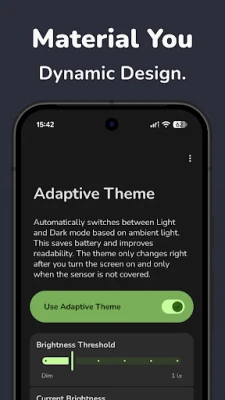 Most Android phones only switch themes at sunset or based on a fixed schedule. Adaptive Theme uses your light sensor to switch intelligently, optimizing both eye comfort and battery life.
