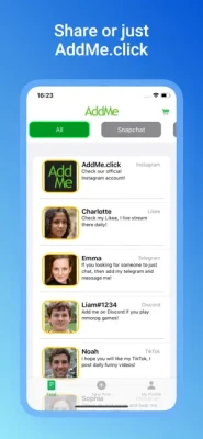Welcome to AddMe, your ultimate social networking gateway! A first of its kind, AddMe is a cross-platform application that lets you share your usernames from some of the world's most popular social media platforms - Snapchat, Instagram, Likee, Discord, Telegram, and TikTok.