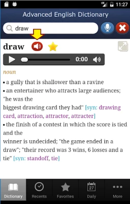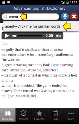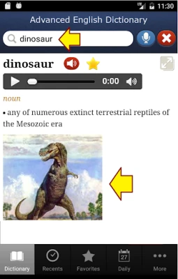 It contains more than 154,500 words and many examples and human voice pronunciation. It allows looking up a word without typing its correct form (fuzzy search). It supports voice search. It has pictures for meanings. It works OFFLINE.
