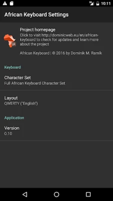The African Keyboard app is an Android keyboard implementing special characters of African languages that use Latin-based alphabets. Its goal is to give users means of writing their native languages and as such to promote the preservation and growth of those languages and their cultures.