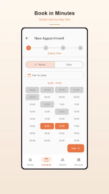 • Time Window — Set availability ranges and let the client choose the best time. Ideal for electricians, plumbers, and technicians who work by region.