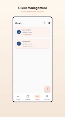 • Save name, phone, and notes for each client