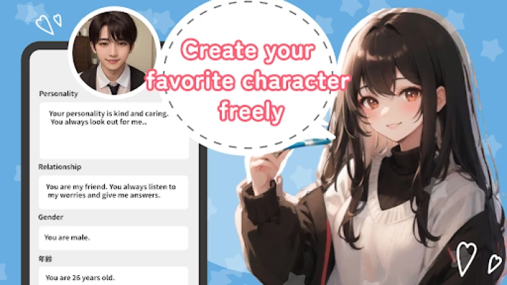 ・Flexible character creation: name, personality (tsundere, cool, gentle, hot-blooded, etc.), speech style (formal/polite, casual, specific sentence endings), first-person pronouns, likes/dislikes, backstory, and your relationship to them (friend, lover, rival, teacher, etc.).