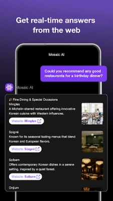Ask questions and get the most up-to-date answers from the web. Whether you're researching travel tips, current trends, or in-depth knowledge, Mosaic AI can find and summarize information in real time.