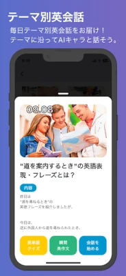 毎日テーマ別英会話をお届け。そのテーマに沿って、好きなキャラクターと英会話できます。