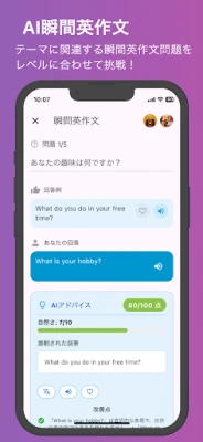 「英単語」「瞬間英作文」「会話」において、過去に学習した履歴を確認することができます。「瞬間英作文」と「会話」に関しては、AIによる採点やアドバイス・改善点なども確認できます。英文音声の再生や、日本語訳も確認可能です。