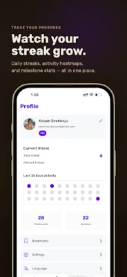 Track your study streak, quiz attempts, and flashcard stats.