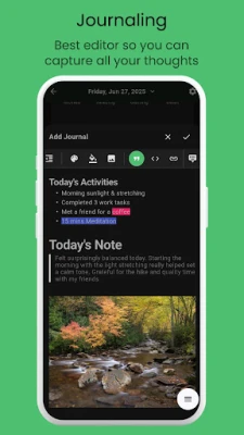 Track your mood in seconds. Tap to log how you're feeling—happy, sad, anxious, motivated, calm, or anything in between. Add activities, thoughts, and tags for a more complete view of your emotional health.