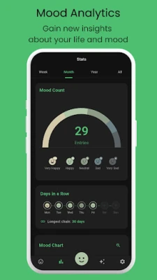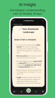 View your emotional trends with smart charts and mood graphs. See weekly and monthly overviews to discover what improves your mood and what brings you down.