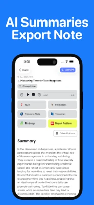 Export and share transcripts, summaries, flashcards, quizzes, and notes
