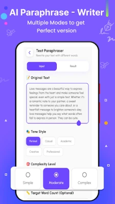 Recreate your text with clarity and style using our advanced AI Paraphrasing Tool. Choose from multiple tone styles (Academic, Casual, Formal, Creative, Professional), set your target word count, and adjust complexity level (Simple, Moderate, Complex). Perfect for rewriting assignments, polishing articles, and creating human-friendly readable content.