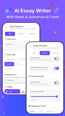 Write flawless essays with ease. Select your essay type (Argumentative, Descriptive, Expository, Narrative, Analytical, Persuasive), tone, length, and academic level. Add custom keywords, citations, examples, and control AI creativity level (0โ100%).