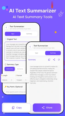 Summarize long texts into concise formats. Choose summary type (Abstractive, Extractive, Key Points), length, and format (Paragraph, Bullet Points, Numbered List). Retain core information while saving time.