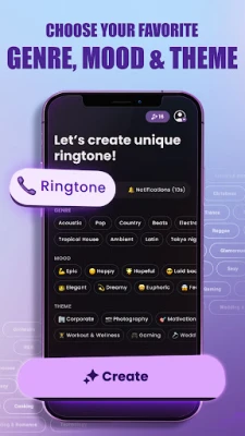 Choose your genre, mood and theme, and create magic IN A SECOND with our AI ringtone maker! Whether you want a catchy tune, a soothing melody, or a unique sound effect, AI Ringtone Generator: RingLab has you covered.