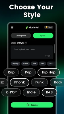 Whether you’re into Rap, Rock, Pop, Country, Auto-Tune, Jazz, Lo-fi, Acapella, or Beats, Musicful helps you create songs in your favorite style.