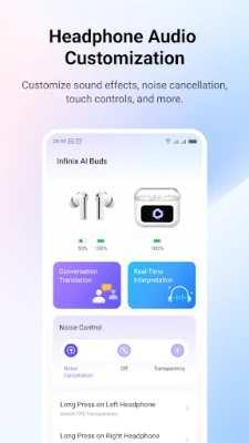 In the app, you can switch between Noise Cancellation, Transparency, and Off with one tap, or set quick switching between Noise Cancellation and Transparency by long pressing on an earbud.
