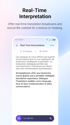 When attending conferences or lectures in a foreign language, you can listen to the translated content through your earphones with the app. The transcription and translation results will also be displayed in real-time on the app.