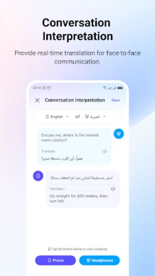Realize cross-language and face-to-face communication for daily conversations. Put on the headphones and start speaking via Headphones by tapping a button on the app or tapping either headphone. Your phone will provide real-time translation and audio output.