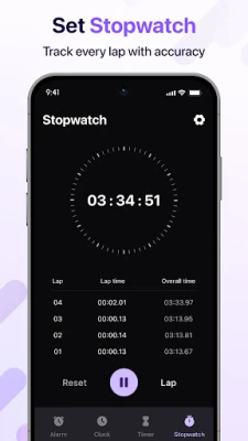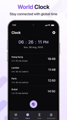 - All-in-one convenience: Alarm, Stopwatch, Timer & World Clock in one app.