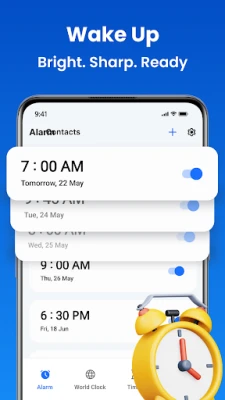 An Alarm Clock - Wake Up Gently is designed to alert individuals at a specified time, primarily to wake them from sleep or naps. The Alram Clock app provides Alarm, World Clock, Stopwatch, and Timer features. Use the Clock app to manage your time efficiently.
