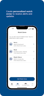 With the Alert SA App, you can create up to 10 watch zones to receive notifications about hazards occurring in areas of interest to you. The app uses your mobile device’s GPS location and requires an internet connection to receive data.