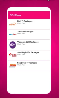 This app also provide to check dth plans and packages. It include tata sky packages, sundirect packages and all. Also you can do electricity bill pay through this app.