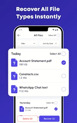 With our All Recovery: Photos & Videos app, you can easily restore many different file types, even without root access. Whether you accidentally deleted your favorite photos, important videos, or work documents like PDF, CSV, XLSX, and TXT files, this photo recovery app can help bring them back in just a few taps. It quickly scans your device and displays a list of recoverable files, allowing you to select exactly what you want to restore. 📂