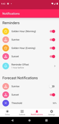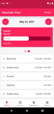 - Check Sunrise/Sunset Quality Predictions. - View Sunrise, Sunset and Magic Hour times. - Use Siri to easily access predictions for the next sunrise or sunset. - Setup notification reminders for Sunrise, Sunset and Golden Hours. - Choose when Alpenglow delivers reminder notifications. - Dark Mode - Share predictions to your Family & Friends, Social Networks & favorite apps.