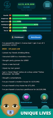 Dive into AltLife, a free text-based life simulation game where each tap on the "Age" button uniquely shapes your life story.