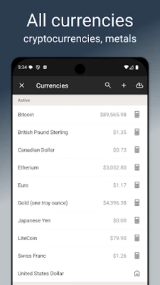 The program supports an unlimited number of currencies. Initially, the list already contains almost all currencies of the world, plus precious metals. Also you can add your own currencies, including "virtual" ones, i.e. you can keep track of money and other things (metals, petrol, units of measurement). Exchange rates can be downloaded from the Internet.