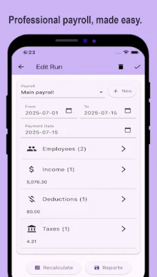 • Add unlimited employees with complete records: salary, ID, pay schedule, and notes.