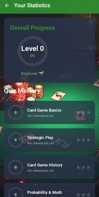 Test and expand your knowledge with a structured quiz system designed to challenge and educate. Four themed quizzes cover the essentials of card games: basics, strategy, history, and probability. Each quiz includes ten carefully designed questions with detailed explanations, ensuring that every session strengthens your skills. Track your long-term progress, earn achievements, and monitor improvement as you rise through the ranks.