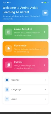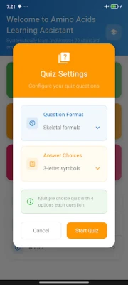 Customizable Settings: Tailor your learning experience by selecting specific amino acids for flashcards and quizzes, ensuring focused study sessions.