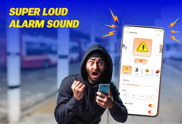 - Loud enough to shock, scare, and instantly stop thieves from touching your phone. Choose from a variety of maximum volume warning sounds like: Police sirens, gunshots, alarm clock, baby, church bell, car horn...