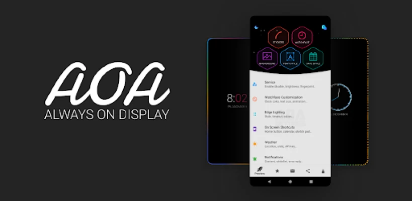AOA is a ground breaking always on display which allows you to interact with notifications, view time/date, weather forecast, control your music, set app shortcuts, and much more right from your screen.