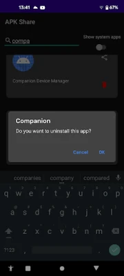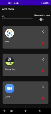 - Share your personal or system APKs through available sharing tools - Delete your desired APKs - Quickly search for needed APKs - Hide/Show only system or your personal APKs
