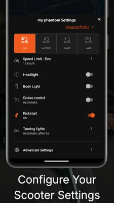 Everything you need, in fewer taps. We focused on making every flow feel natural and easy. You can connect via Bluetooth and tweak your acceleration or braking exactly how you like it. With the new Profiles feature, you can jump between your favorite scooter settings in a second. Managing your scooter is simple too. You can register your ride, update firmware, or flag your scooter as stolen if you ever need to, all in one spot.
