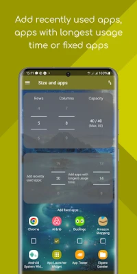 Space-saving View: While standard launchers are often limited to 5 apps per row, this widget offers full freedom. Place e.g. 40 apps (5 x 8) in the same space that normally fits only 10 apps (2 x 5).