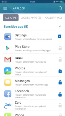 - Apps lock uses the Device Administrator permission to prevent other users from uninstalling. This is OPTIONAL feature.