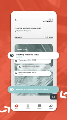 Check at any time and from anywhere whether a machine is free and save yourself the waiting time or plan your next wash in advance by reserving a machine for the next few days. Top up your credit via the many available payment providers and you're ready to go!