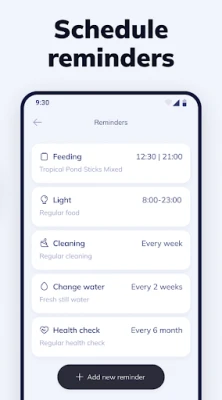 ● Set Reminders for Care: Stay on top of feeding, water changes, filter maintenance, and testing with customizable alerts – perfect for busy aquarists.