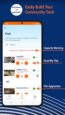 - Add your fish to your aquariums – get an alert if any are incompatible or if your tank is overcrowded