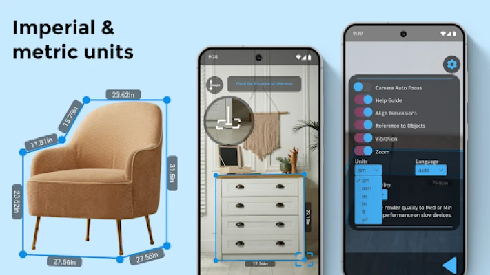 Measuring tools no longer need to be bulky stowed away in a toolbox. Your phone can now serve as a companion that helps measure dimensions with AR Ruler: Camera tape measure app for android. With just pointing your camera to furniture, wall space, and floor plans you can easily and accurately measure them. All measured angles, dimensions, and distances can all be stored in your pocket.