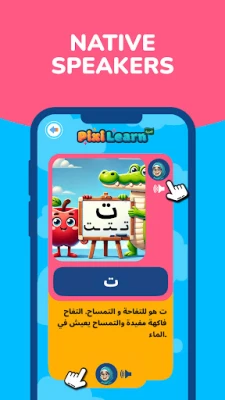 👉 PixiSay: Children say the name of the object shown in the picture. If unsure, they can flip the card to hear the correct Arabic pronunciation.