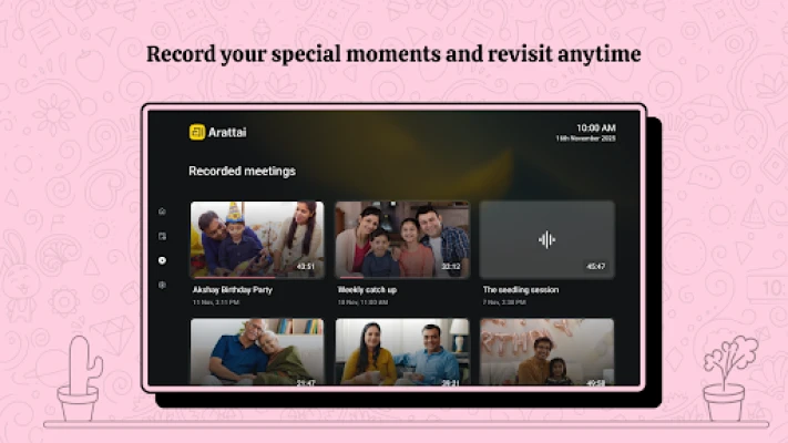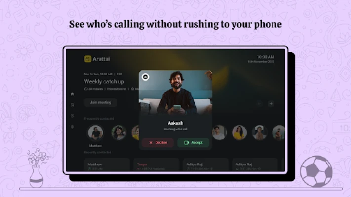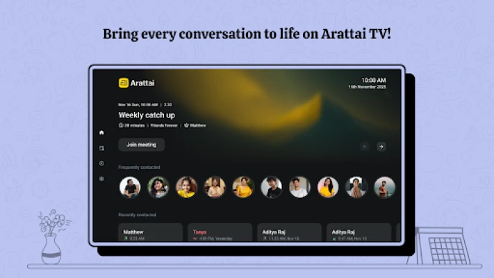 Simple and safe communication, on a large screen. Bring meetings with your friends and family to life with the Arattai TV app. Backed by Zoho's industry-leading commitment to user privacy, Arattai has an unwavering commitment to security and is thus a safe space to communicate. The Arattai TV app is easy-to-use and makes any virtual gathering seamless, anytime.