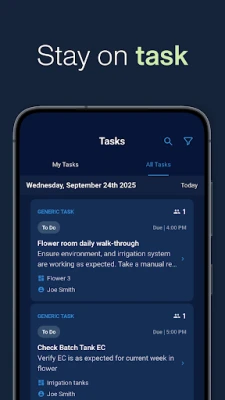 AROYA Mobile extends the power of your AROYA system, giving cultivation teams fast, intuitive access to key insights and tasks. Whether you're walking through grow rooms or managing remotely, AROYA Mobile keeps you connected to the performance and progress of your operation.