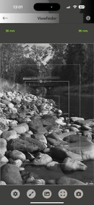 Focal lengths are switched by tapping on the current focal length indicator (upper right corner), formats - by tapping on the format indicator in the upper left corner of the screen.