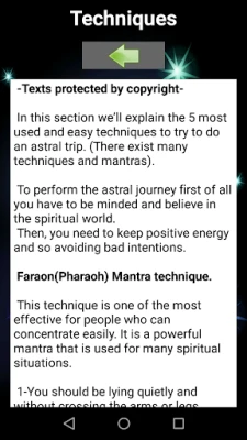You can find the most used techniques for astral travel and also includes the pharaoh mantra in audio to help us with spiritual concentration.