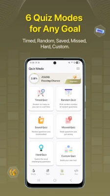 • Quick Study Modes: Practice with random, timed, missed, and saved quizzes — ideal for fast learning anytime.